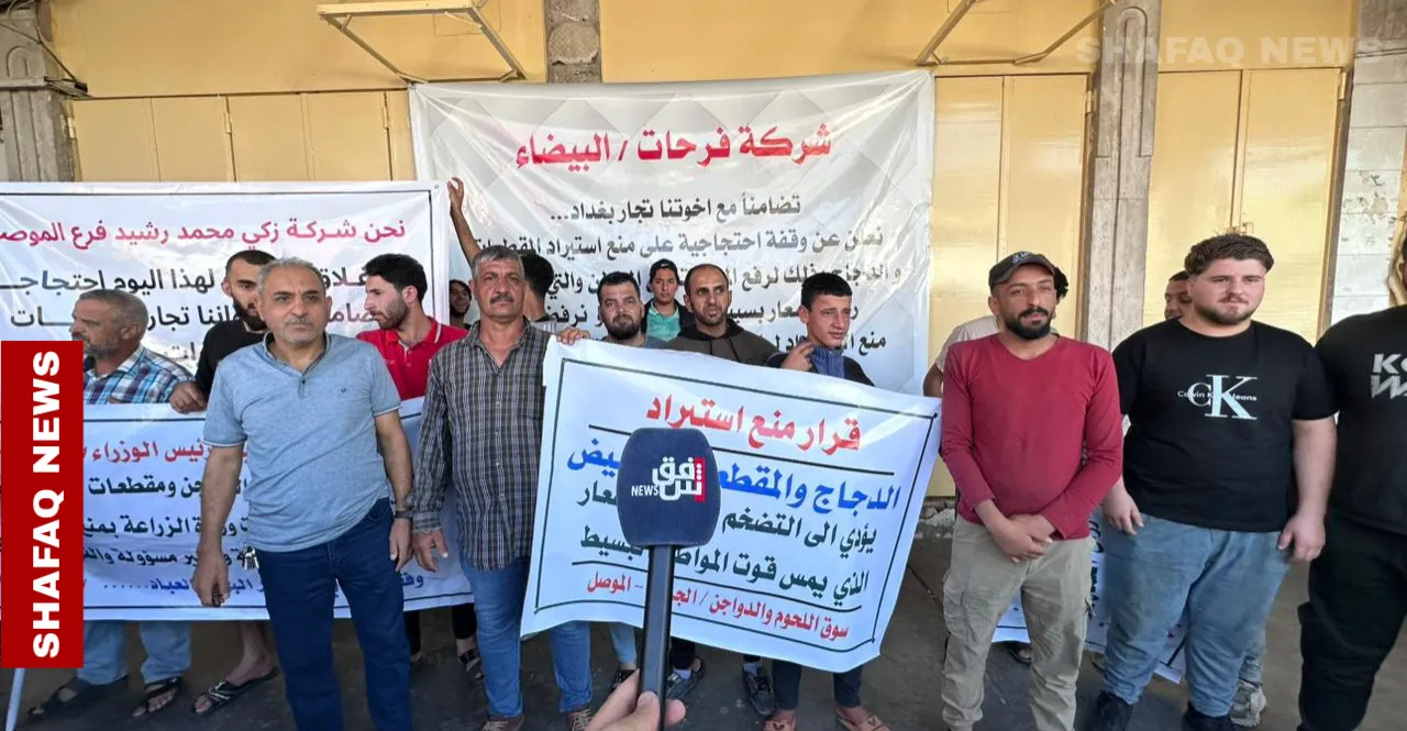 شهدت مدينة الموصل، اليوم الأحد، وقفة احتجاجية نظمها عشرات التجار رفضاً لقرار وزارة الزراعة العراقية القاضي بمنع استيراد اللحوم، فيما أكدت الوزارة أن أسعار الدواجن والبيض مستقرة وأن الإنتاج المحلي كافٍ لتغطية حاجة السوق.