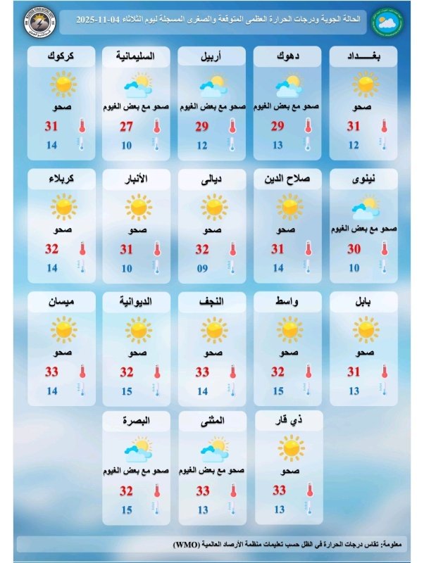 توقعت هيئة الأنواء الجوية، اليوم الثلاثاء (4 تشرين الثاني 2025)، أن تشهد البلاد أجواءً مستقرة وصحوة عموماً، مع ظهور غيوم متفرقة في بعض مناطق الشمال والجنوب وأجزاء من الوسط بشكل متقطع.
