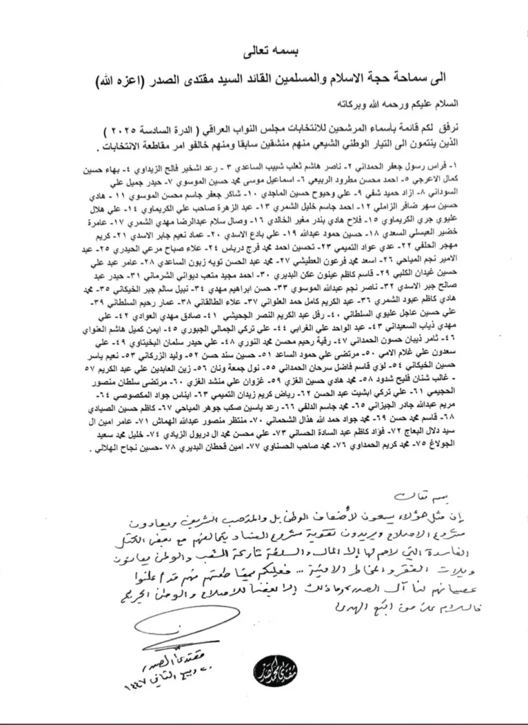 وأجاب الصدر، على قائمة تضم 78 مرشحاً ينتمون للتيار الوطني الشيعي، منهم منشقون سابقاً ومن خالفوا أمر مقاطعة صناديق الاقتراع، بالقول إن “مثل هؤلاء يسعون إلى إضعاف الوطن، ويعادون مشروع الإصلاح وتقوية مشروع الفساد”.